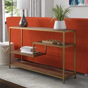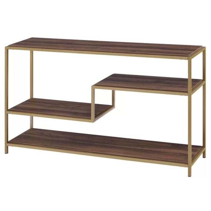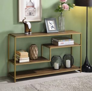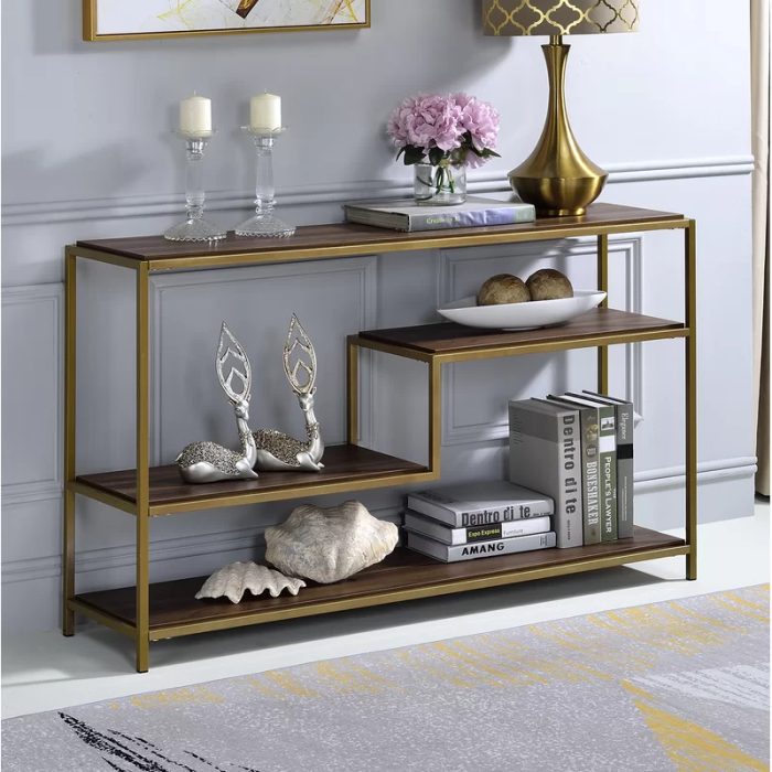 The thoughtfully designed four-tier shelves offer ample space for showcasing your favorite decor items, books, or organizing essentials. The golden frame and dark wooden color lamination create a striking contrast, making this console table a focal point in any room.